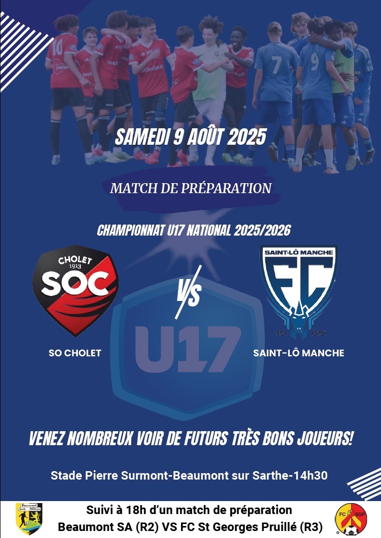 Ce samedi 9 Août 2025 aura lieu à 14h30 au stade Pierre Surmont un match amical opposant les U17 nationaux du FC Saint Lô Manche à ceux du SO Cholet. Ce match sera suivi par un match amical séniors opposant le Beaumont SA (R2) au Football Club Saint Georges Pruillé (R3) à 18h.