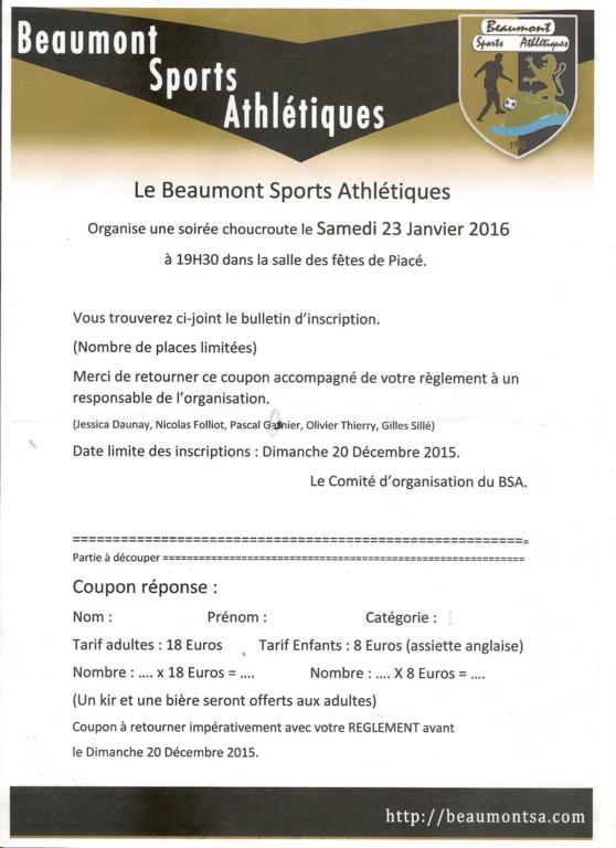Le Beaumont SA organise pour la deuxième année sa soirée choucroute le Samedi 23 Janvier 2016 à 19H30, des inscriptions sont encore possibles.