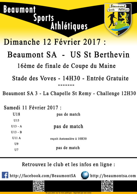 Dimanche 12 Février 2017 à 14H30 au Stade des Voves.