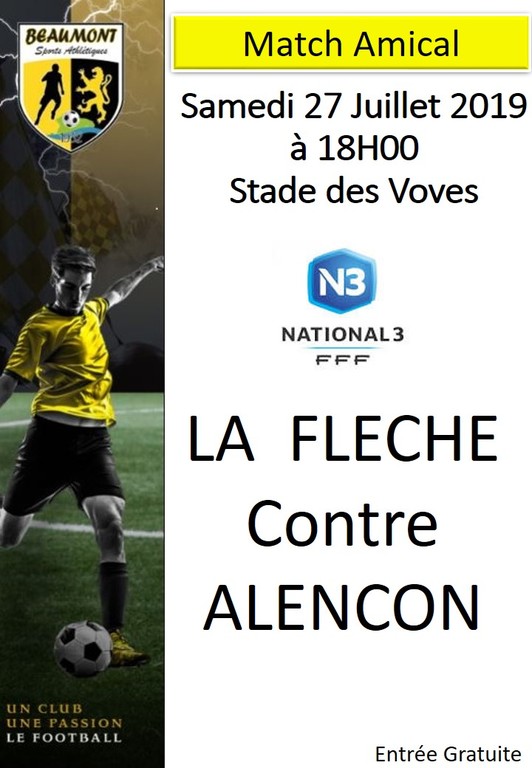 Samedi 27 Juillet 2019 se déroulera au stade des Voves , un match amical de National 3 La FLECHE contre ALENCON Début de la rencontre à 18H00. Entrée Gratuite