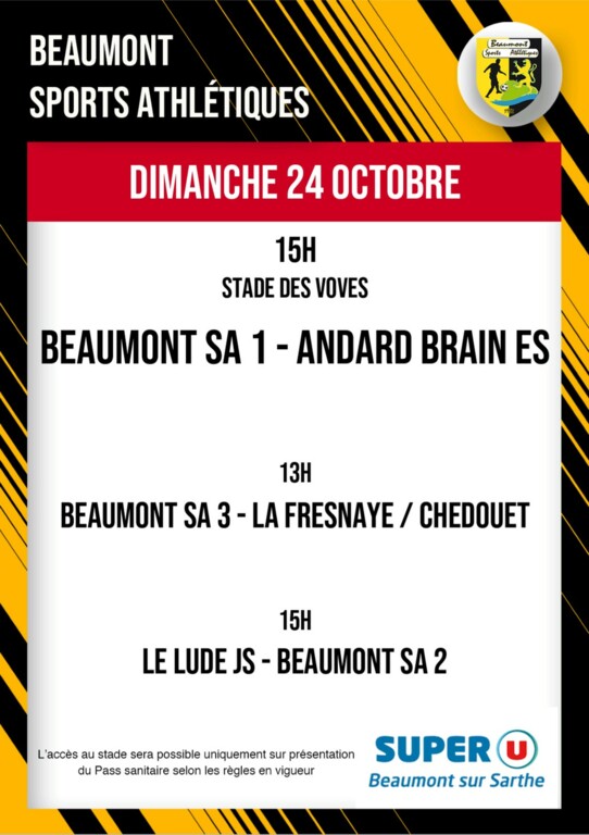 Dimanche 24 octobre 2021 se jouera le premier match de championnat de l'équipe première contre Andard Brain au stade des Voves à 15H. Venez nombreux encourager notre équipe 1 ainsi que l'équipe 3 qui jouera à 13H contre La Fresnaye/Chedouet. Buvette sur place avec restauration. Pass sanitaire obligatoire.