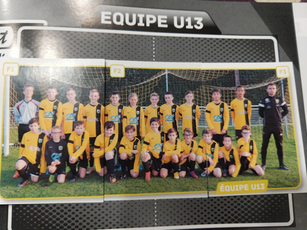 Une petite erreur dans l'album du club a été identifié. Il y a F1, F2, F3, F4 sur l'album à remplir pour l'équipe U13 alors que seulement les vignettes F1, F2, F3 sont nécessaires. Je vous laisse rectifier comme sur la photo.