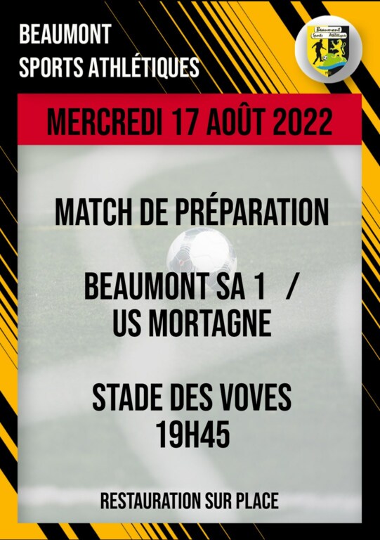 Deuxième match de préparation pour l'équipe 1 du Beaumont SA mercredi 17 août 2022 au stade des Voves à 19H45. Entraînement pour tous les joueurs non convoqués à 19H30.