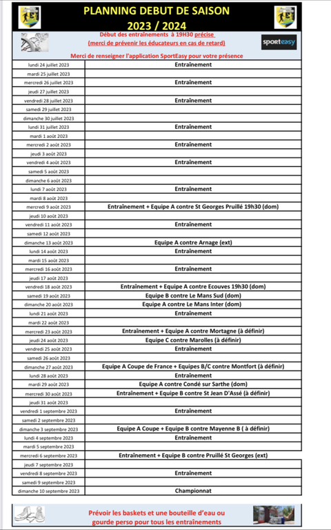 Planning entraînements saison 2024-2025
