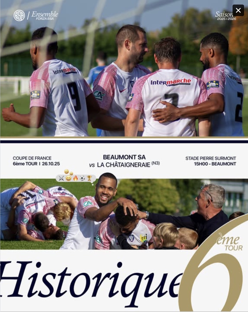 🏆 Coupe de France — 6ème tour 🏆 Le tirage est tombé ! 👀 Nous retrouverons La Châtaigneraie le dimanche 26 octobre, pour un nouveau choc à domicile ⚔️ Un adversaire bien connu… puisque l’an dernier, il ne nous avait manqué qu’un souffle pour créer l’exploit (2-2, puis défaite 3-4 aux tirs au but) Votre soutien sera essentiel pour porter l’équipe vers l’exploit et marquer à jamais l’histoire du BSA ! Ensemble - Forza BSA !
