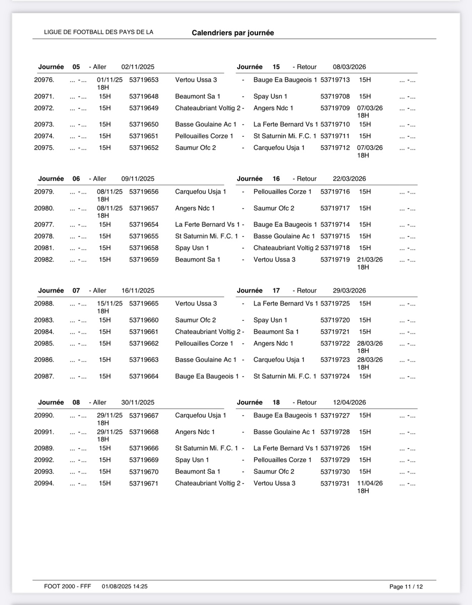Calendriers des équipes